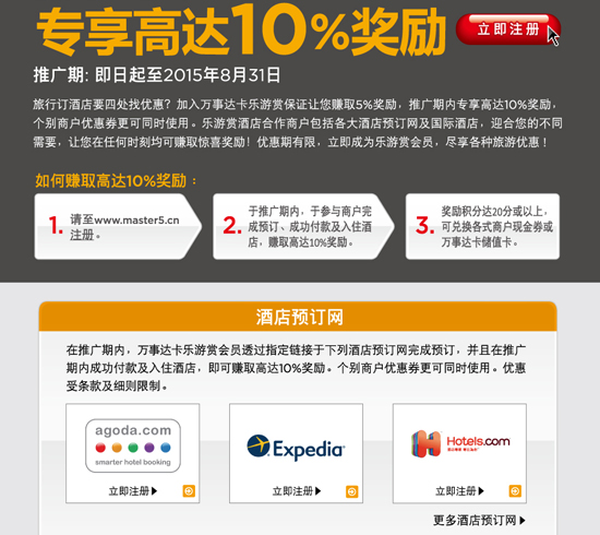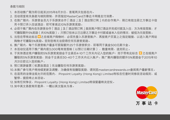 暑期马上就要到来,旅游旺季即将开始。即日起到831日,刷万事达卡可专享高达10%奖励。个别商户优惠券更可同时使用。乐游赏酒店合作商户包括各大酒店预订网及国际酒店。活动详情请登录www.mastercard.com/cn优惠礼遇——“入住星级酒店刷万事达卡专享高达10%奖励活动专区进行了解。建行万事达理财金卡持卡人、白金卡持卡人、万事达信用卡持卡人均可享受活动优惠(详见图例)